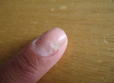 甲分离:被破坏的甲板,缺乏原有的韧性和弹性,变得比较脆,角质颗粒呈粉末状,很容易会出现脱落、松散而变得碎杂。